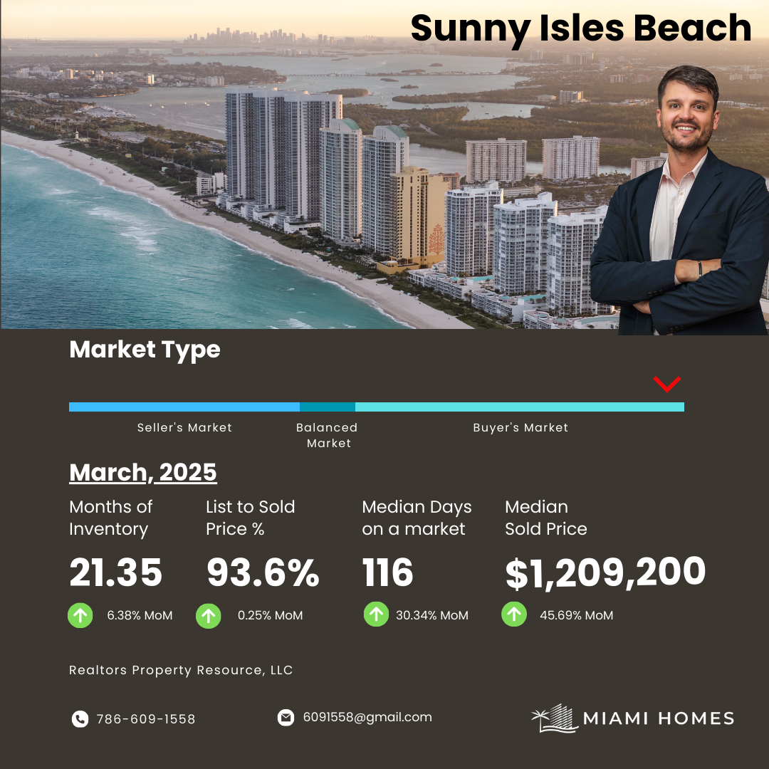 North Miami Market Update – May 2025With 13.87 months of inventory and homes staying on the market for 68 days, North Miami is firmly in buyer’s market territory. Despite a high list-to-sold ratio of 97.2%, inventory and days on market are up significantly. A strong opportunity for buyers looking to negotiate favorable deals.Sunny Isles Beach Market Snapshot – May 2025Sunny Isles Beach shows 23.63 months of inventory, with homes taking an average of 98 days to sell. While median sold price has surged to $1.2M, buyer power is increasing due to sluggish turnover. Sellers are still closing at 93% of...